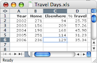 For the past few years I’ve been traveling a significant part of the year. I like to say I’m gone half the year, but 2006 was more like a third. I like to keep records, but it’s hard. On a given day I can go several hundred miles and pass through multiple states. I’ve settled on recording the location where I spend the night, and be content with that. I try to record each night’s location on a calendar and then count up the days at the end of the year.