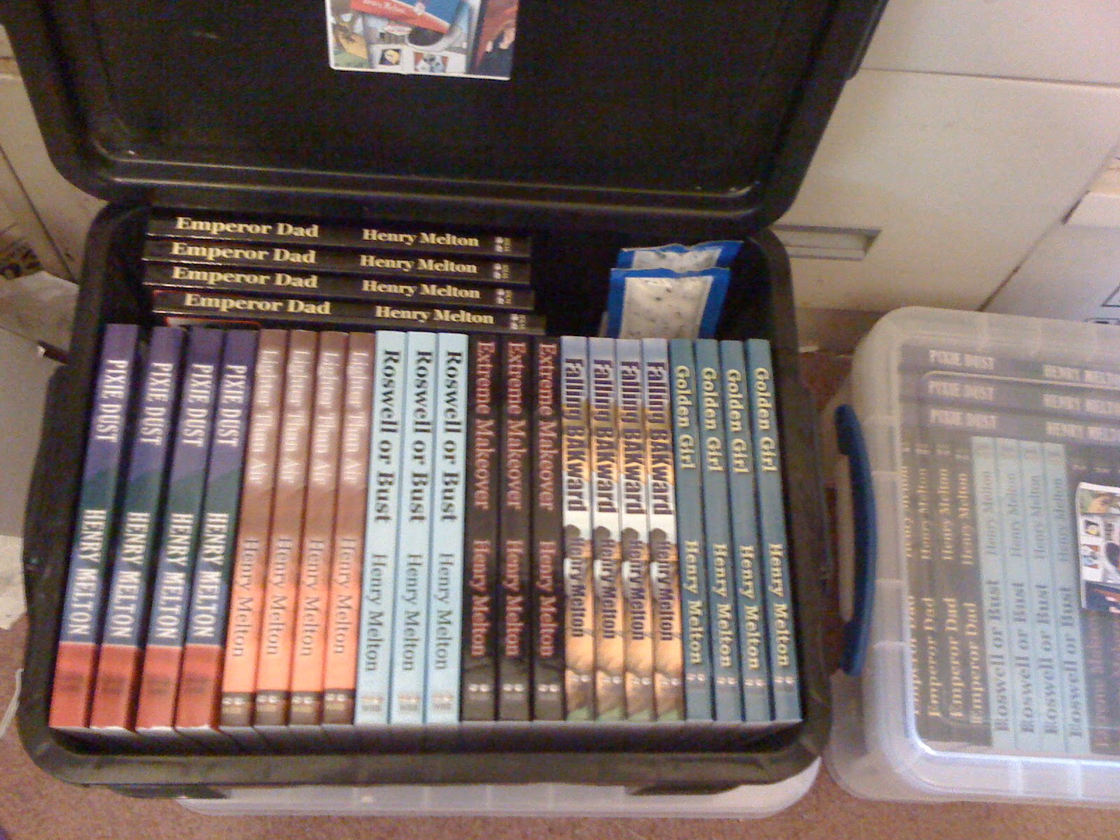 When the shipment of Pixie Dust arrived a couple of days ago, that meant I had to repack the box, to take out a few other books to add the new ones. I can keep this up for a while, until I have more than 20-some titles out, and then I’ll come up with another solution.