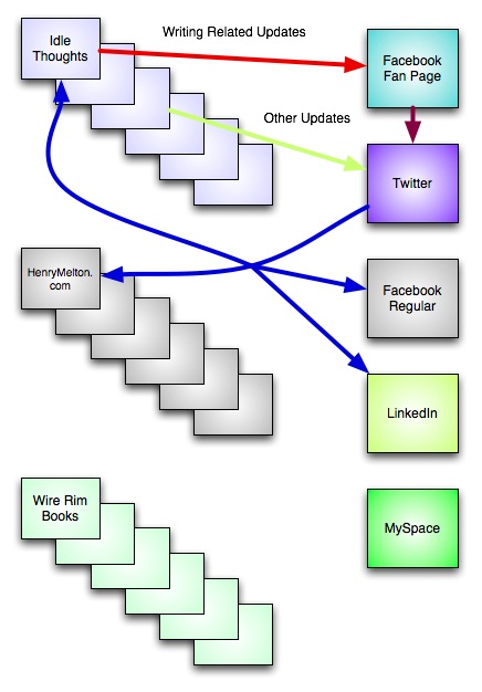 When Twitter rolled around, it was clear that this was a happy way to add current information to many of the sites. A little snippet of code could be included in each of the other sites and recent tweets would show up on appropriate sites. When I added a Facebook ‘Fan’ page, there was the option to tweet whenever I posted something to the page. Currently, Twitter is the core of the information flow among the sites, although I can start by tweeting directly, or by posting something writing related to the Facebook Fan page. If it’s not writing related, I skip directly to Twitter.