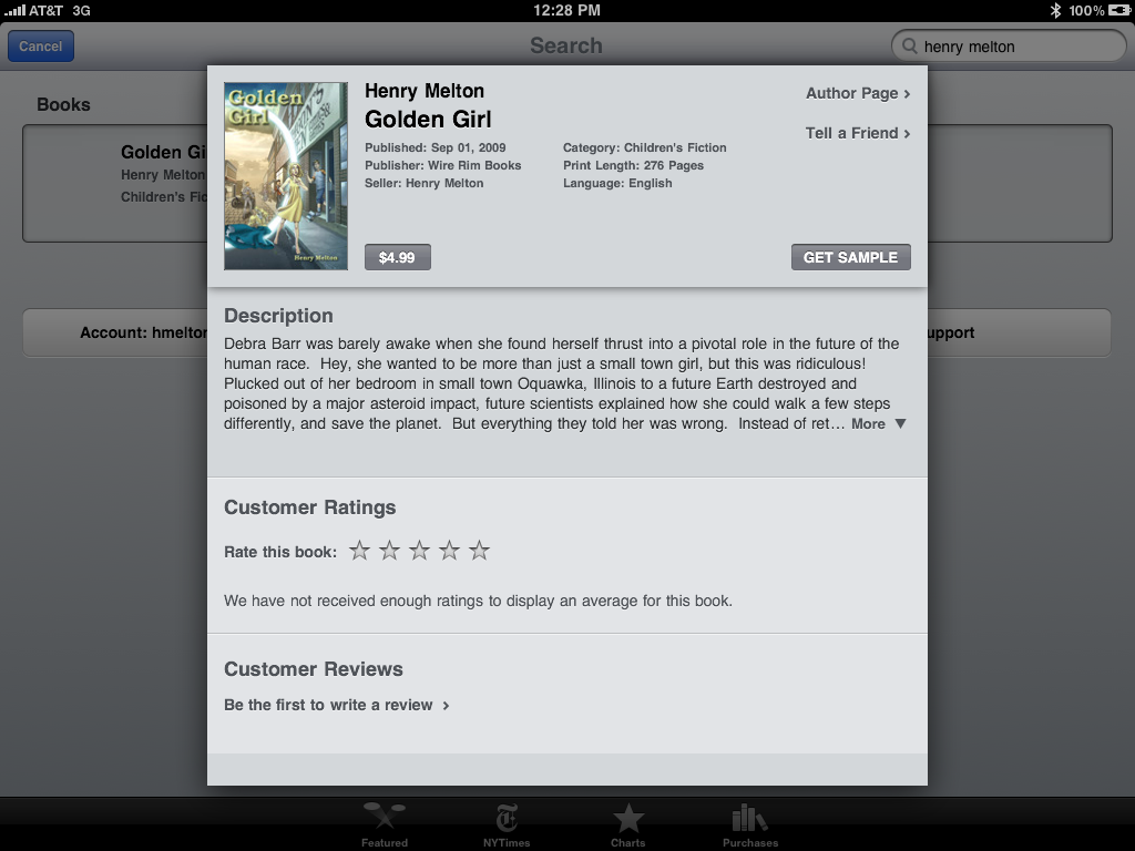 One thing I would love to have is a URL, so that I could direct people to my books, but I haven’t seen one documented yet. Additionally, as of the current date, you can’t even get to the iBookstore without an iPad. That is all likely to change soon, as the iBook App and the iBookstore will soon be available on iPhones and iPad Touches as well. Currently, to find my books, just search for Henry Melton and all of them that are available will show up.