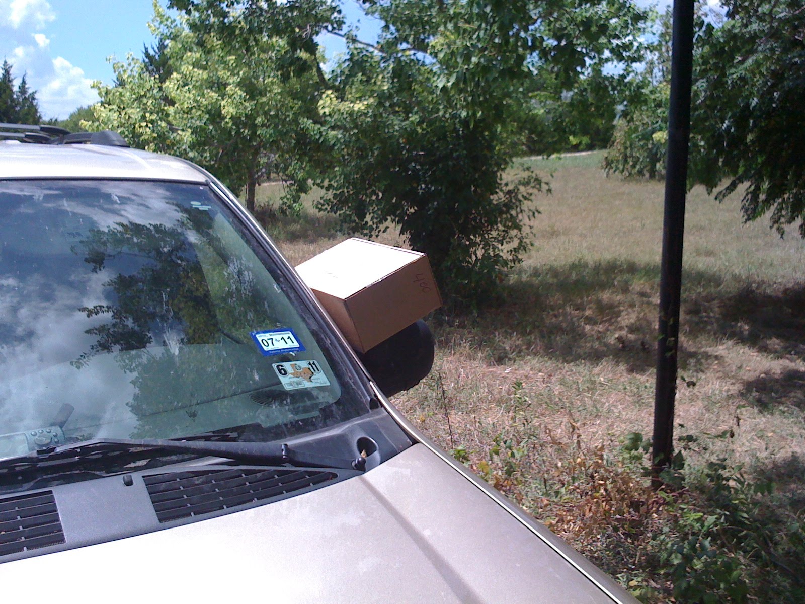 So I started sending out invitations to bloggers, and hoped that the books would arrive by the time the requests started arriving. I checked the FedEx tracking data and discovered that it was due yesterday, Friday the 13th. I started checking the driveway, about once an hour, because I know that sometimes, when the driver is in a hurry, he won’t wait for me, sometimes I suspect that he doesn’t even walk to the door. Like this delivery. The box of books was balanced on the rear view mirror. I was in the house. No one knocked. I had to go get Mary Ann and show her before I touched it. We laughed. At least he didn’t hide the delivery in the pool chemical box like a DHS guy did.