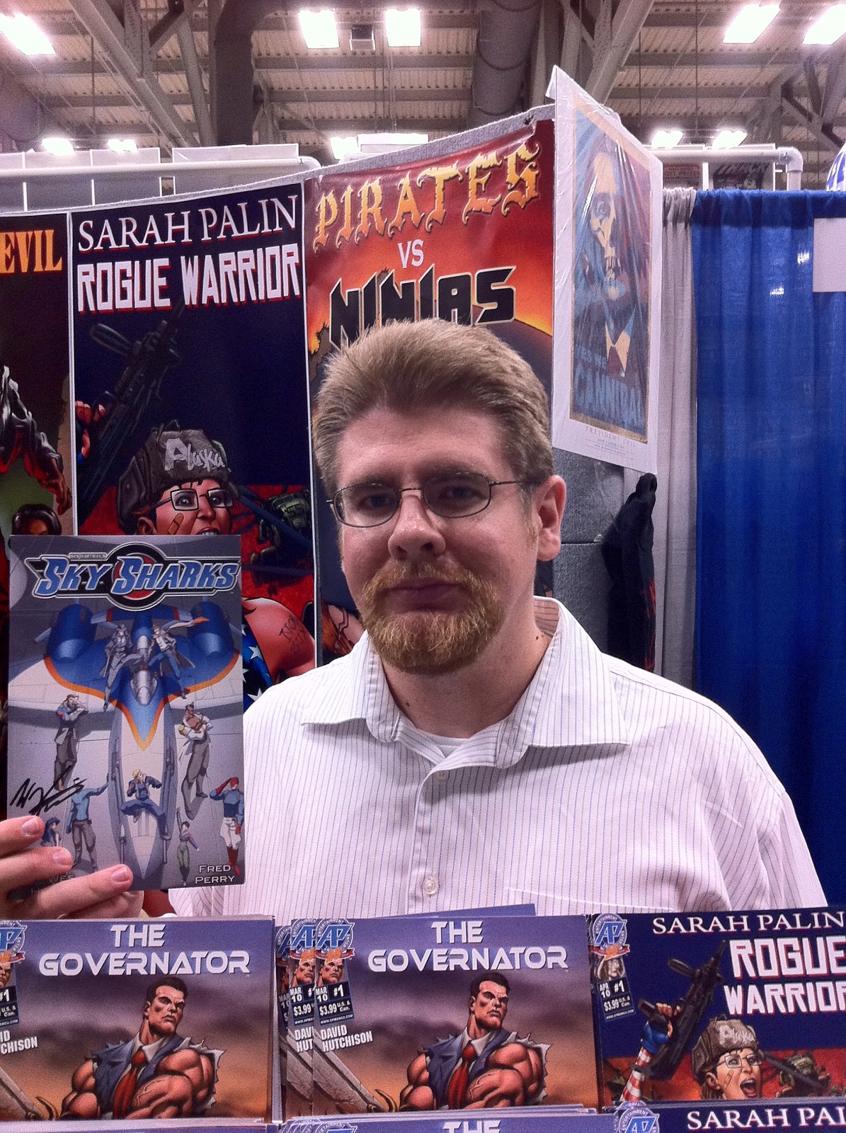 We shook hands and I got to see what he looked like. (I also picked up an autographed copy of his Sky Sharks.) If you get a chance, drop by his booth #503 and meet him yourself while he’s here in town.