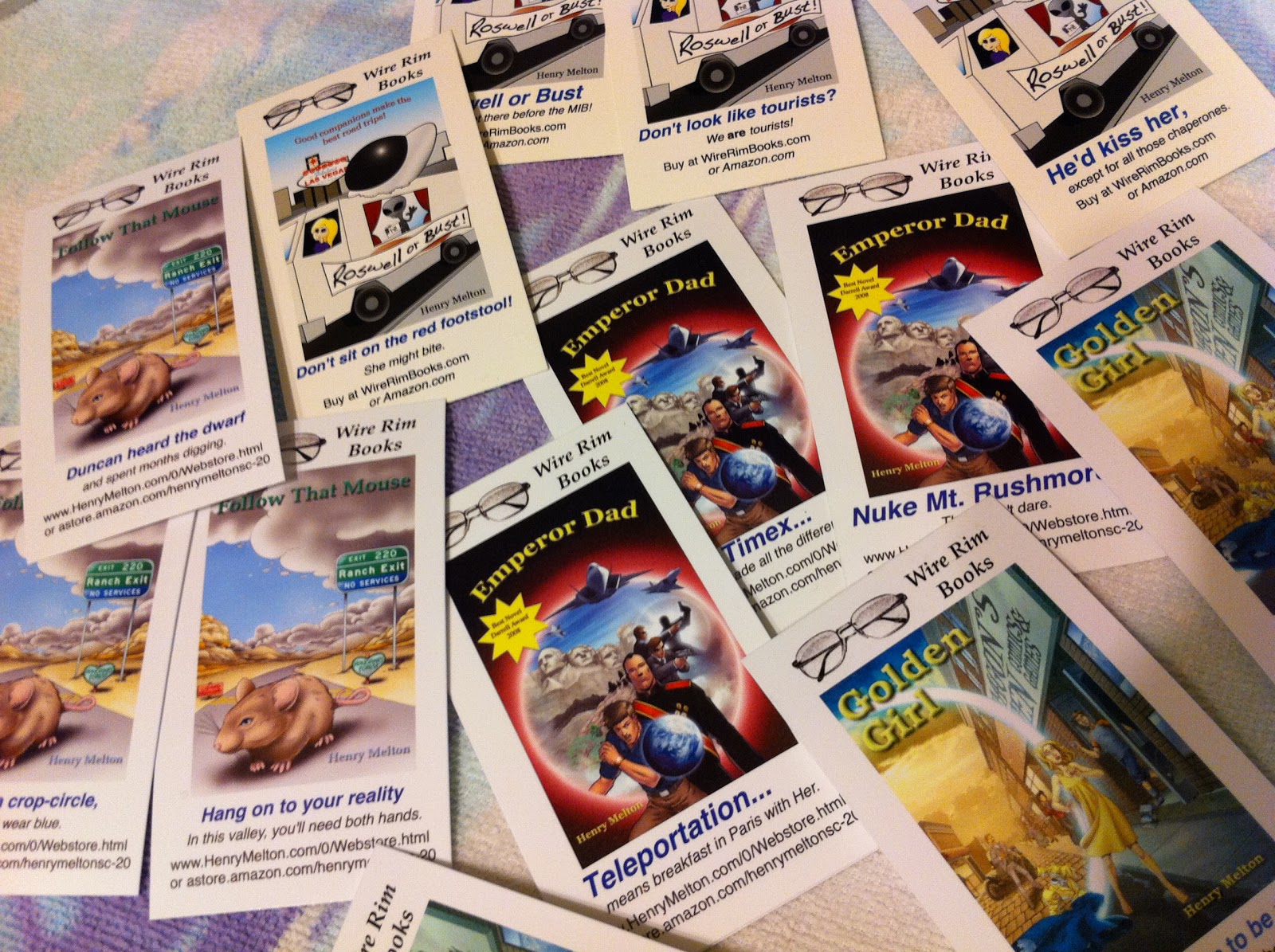 The received wisdom of merchandizing handouts for promoting your book is that you need bookmarks and picture postcards to give out at your readings and personal appearances. While I wanted to do that, it never quite worked out. My first book, Emperor Dad was done as an experiment and while I ordered the PR kit from Lulu, I think I still have some of those unused postcards around some place, if I haven’t already thrown them out. I didn’t like the looks of them, and they were too expensive for what I needed, especially since they seemed to be advertising Lulu more than my book. When I switched to Lightning Source as my printer, I needed something different.