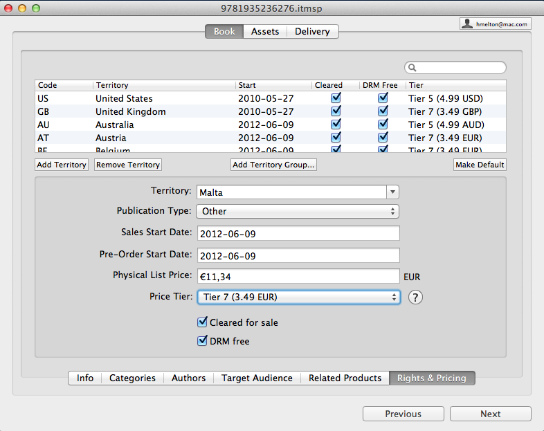 UPDATE: 7/26/12 : I just received an email from Apple stating that ‘based on your feedback’, they had made changes in the software to allow quick population of all the international markets based on exchange rates. The next time I add a book, I’ll try that out. Hmm. I wonder if they read my blog or if that ‘based on your feedback’ thing is boilerplate for all users. I suspect they got quite a few official feedback messages.