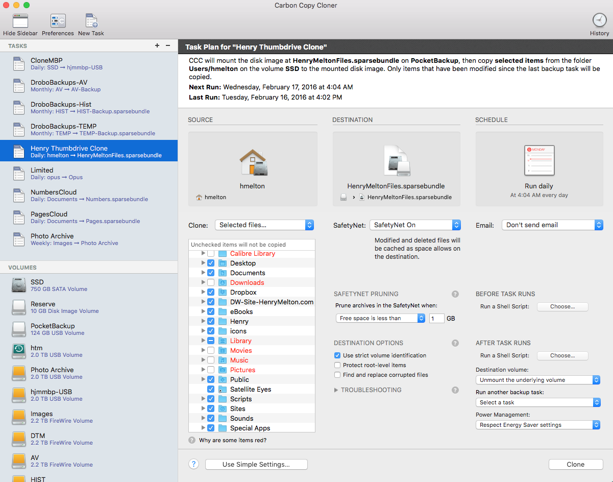 Carbon Copy Cloner waits for it to be inserted. Then it mounts the encrypted disk image, makes the daily changes, and then dismounts everything. The initial backup took a little while, but typically, it all takes one minute, or maybe two or three if I’ve loaded some large files. I’ve got a daily reminder at 4 pm to plug it in. The menubar icon for CCC turns black while the backup runs and when it turns white, I can unplug it and stick it back in my pocket. All the mounting and dismounting is handled by the program. It’s so easy, I haven’t missed a day since I started it.