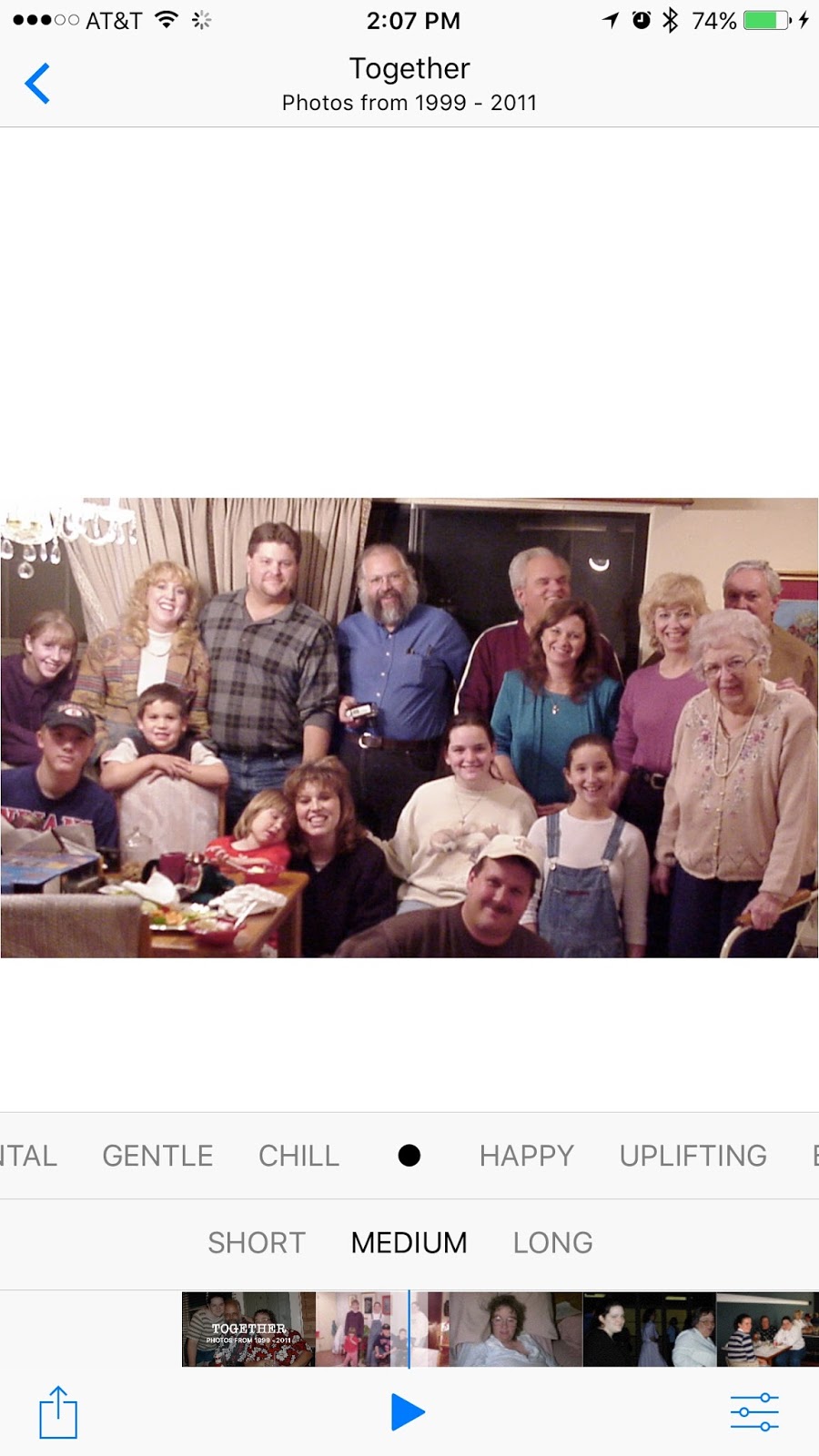 If Apple advertised this feature, I was thinking about something else at the time, because I just stumbled over the changes while picking a photo for a Facebook post. Down at the bottom of the Photos screen is a tab labeled Memories. I tapped it and discovered that Photos has been doing some work behind the scenes for me. It has taken the location information, the timestamps and some serious photo analysis to look at my phones. Then with that information, it has composed several videos automatically. It did a Best of the Year for 2015, a family photos collection, and several trip videos.