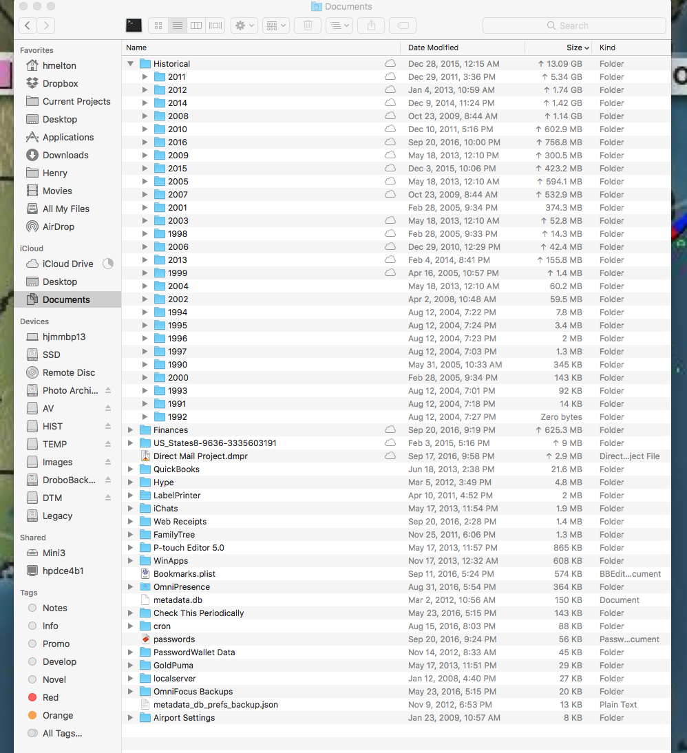 Now, I could move some of this stuff out of Documents first, and I did for a couple of very dynamic items that didn’t need to be shared across machines. But I sort of like the idea of being able, on a whim, on the road, to dig down into my 2002 archives to find a shell-script that I wrote long ago and has some features I might want to look at again.